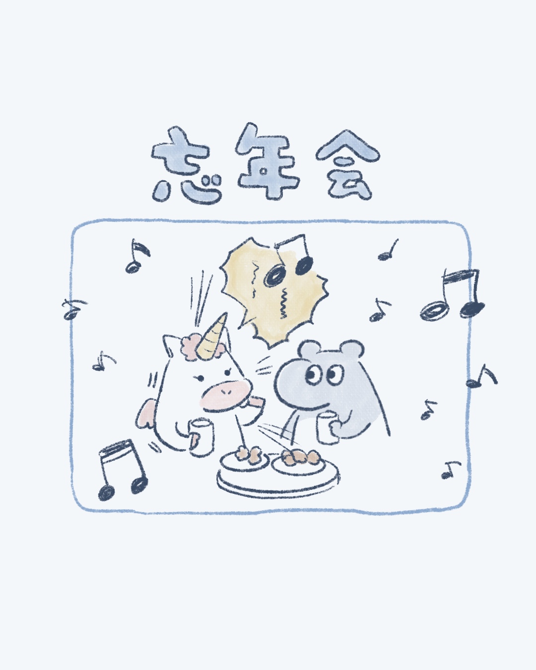 忘年会に限らず人が多い場所って、目の前の人が発信してる周波数だけを受信して会話をしたいのに、隣や後ろの人の周波数に合っちゃってそっちの会話をずっと拾い続けてしまう、みたいな現象起きませんか。目の前の人話してくれてるのに。やはりある程度人が少ない場のほうが話しやすいですね。でも人少なすぎ静かすぎもそれはそれで話しづらいんだよね!めんどくさいね!