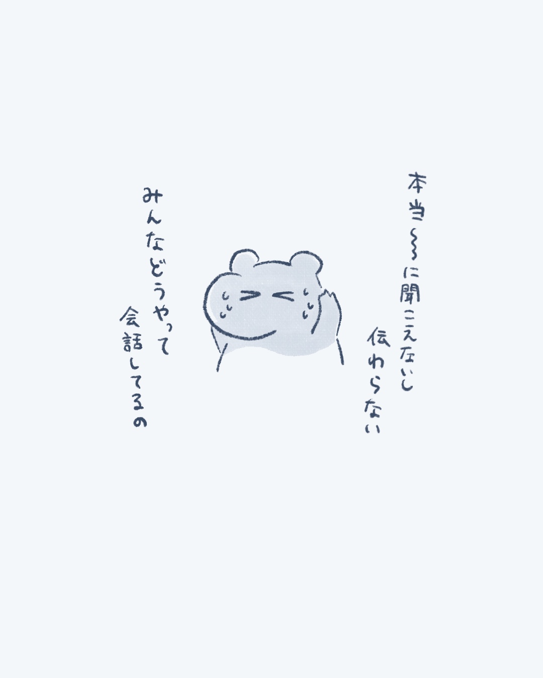 でも他の人たちは割と意思疎通できていて。「どうやって会話してんの?」と不思議に思ったのでした。このことを姉に報告すると「聞こえてるふりしてるだけで、他の人たちも聞こえてないんだよきっと」と言われました。え!!