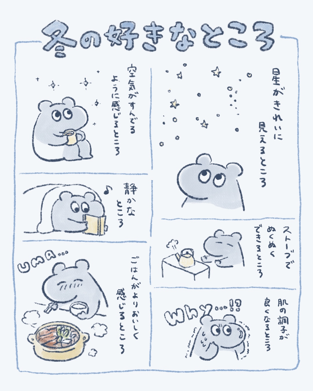 日常 冬の好きなところ バク・タダノ 2026年1月5日 冬が好きです。昔からそうです。 頭の中の「景色」の記憶も、ぱっと思い浮かぶものは全て冬景色です。 どうして好きなんだろう?と改めて考えると、単純に綺麗、あと内省しやすい季節だから好きなんだと思います。春夏秋冬の配分を自分で選べるなら、春秋冬冬冬冬くらいが希望です。